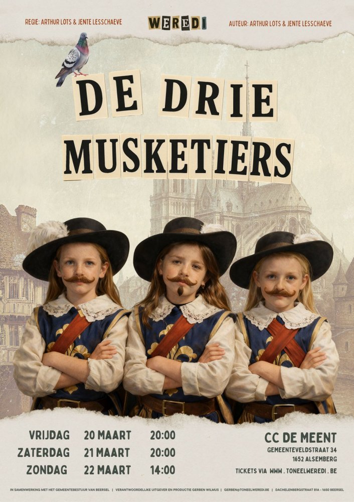 Van Zandweghe Elli (Alexandrine Cœurvoix), Deridder Miel (Thierry Duson), Debrie Juliette (D'Artagnan), Tiels Jirte (Athos), Lots Louise (Porthos), Mostin Nona (Aramis), De Backer Herre (Girard), Verberght Louis (Pierre), Decuyper Gilles (Antoine), Mezni Luna (Mme Couture), Tordeur Pol (Dorpsgenoot Pascal), Sleeckx Estrith (Mme Perruque), Castel Raphaelle (Philemone), De Smaele Lene (Constance), Monbaliu Renée (Bonacieux), Inghelram Ileana (Orphine), Daminet Mon (Mr Mortis), Struelens Andries (Malodeur), Moens Kassandra (Planchet), Maekelberg Tess (Pigeon), Deridder Bas (Koning Lodewijk XIII), Meijnaert Jenna (Opvoedster), De Pauw Finn (Kardinaal Richelieu), Van Gorp Martín (Kapitein Rochefort), Berckmans Ines (Milady de Winter), Al-anbuqy Deemah (Soldaat 1), Debilio Jada (Soldaat 2), Develter Ella (Soldaat 3), Rosseel Basile (Dungeon), Sleeckx Mikaela (Junior), De Pauw Roos (Gevangene 1), Verberght Olivia (Gevangene 2), Geudens Martha (Gevangene 3), Dieryck Grégoire (Gevangene 4), Wouters Marie (Mini-Athos), Magnus Juliette (Mini-Porthos), Castel Charlotte (Mini-Aramis), Verhaegen Toon (Mini-Rochefort)